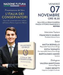 Nazione Futura Rovigo è lieta di annunciare la presentazione del libro “L’Italia dei Conservatori – Storia del conservatorismo italiano dall’antica Roma al governo Meloni” scritto da Francesco Giubilei, presidente nazionale di Nazione Futura.
