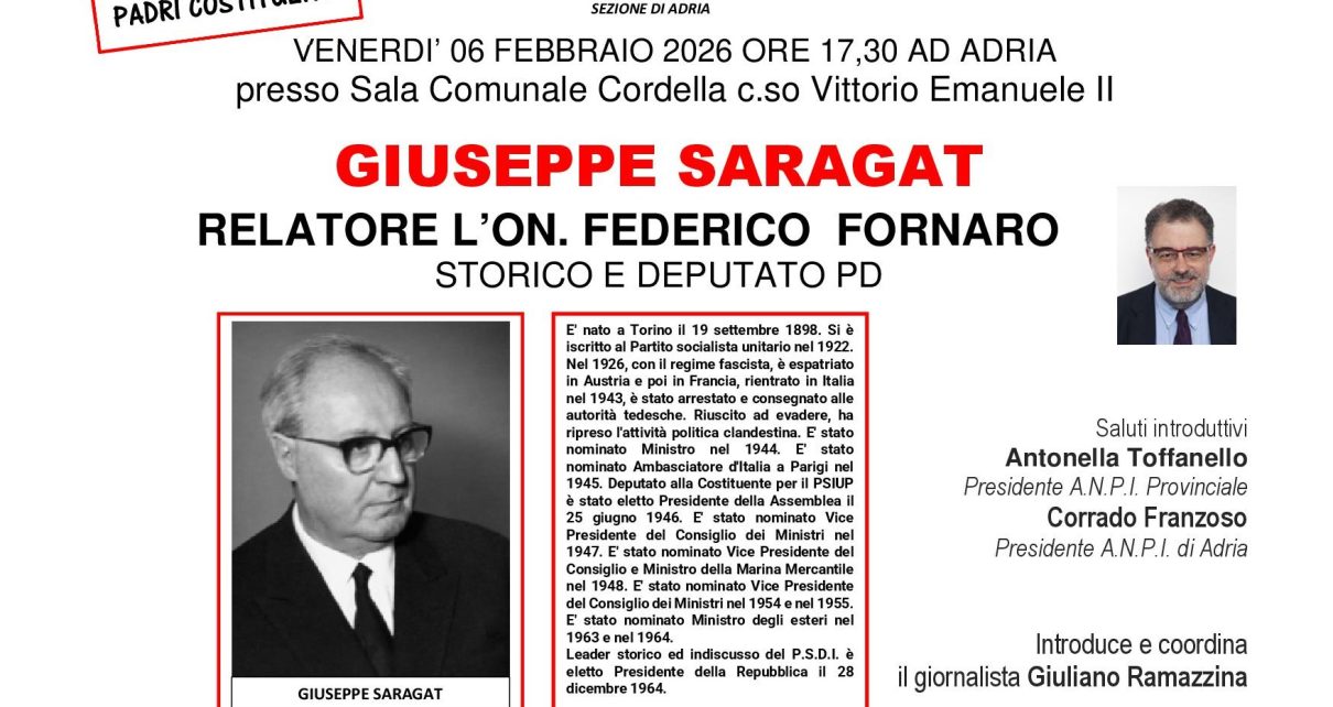 Venerdì 06 febbraio 2026 alle ore 17,30 presso la Sala Cordella in c.so Vittorio Emanuele II ad Adria, l’A.N.P.I. Sezione di Adria “Arduino Nali” presenterà la figura di Giuseppe Saragat. A parlare di G. Saragat sarà lo storico e Deputato PD Onorevole Federico Fornaro; introduce e coordina il Giornalista Giuliano Ramazzina. Ricordiamo qui brevemente alcuni dati […]