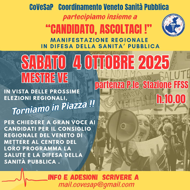CoVeSaP (Coordinamento Veneto Sanità Pubblica) invita ad aderire e partecipare a “Candidato, ascoltaci”, una manifestazione prevista a Mestre (Venezia) per sabato 4 ottobre alle ore 10, con partenza dalla stazione ferroviaria. Questo l’appello del Comitato altopolesano dei cittadini per l’ospedale S. Luca di Trecenta: “In vista delle prossime elezioni regionali, inviteremo i candidati a portare […]