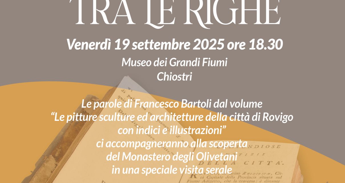 In occasione della manifestazione regionale “Il veneto legge”, il Comune di Rovigo e il Museo dei Grandi Fiumi in collaborazione con Aqualab, propongono “Un Museo tra le righe”, un appuntamento serale dedicato alla scoperta e valorizzazione del complesso monastico di San Bartolomeo attraverso le parole di Francesco Bartoli, scrittore, comico e letterato italiano che nel 1793 pubblica “Le pitture sculture ed architetture della città di Rovigo: con indici e illustrazioni”. Un’opera fondamentale per la ricostruzione del patrimonio storico-artistico rodigino, in quanto al suo interno presenta affascinanti descrizioni delle opere artistiche e dei monumenti presenti all’epoca in città, includendo edifici storici di pregio, fra cui il Monastero degli Olivetani, oggi sede del Museo dei Grandi Fiumi.